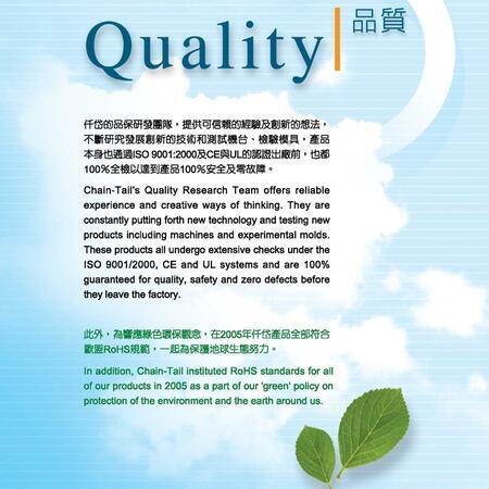 仟岱的品保研發(fā)團(tuán)隊(duì),提供可信賴的經(jīng)驗(yàn)及創(chuàng)新的想法,不斷研究發(fā)展新的技術(shù)和測(cè)試機(jī)臺(tái)、檢驗(yàn)?zāi)>撸a(chǎn)品本身也通過(guò) ISO9001:2000 及 CE 和 UL 的認(rèn)證出廠前,也都全檢以達(dá)到產(chǎn)品 安全及零故障。